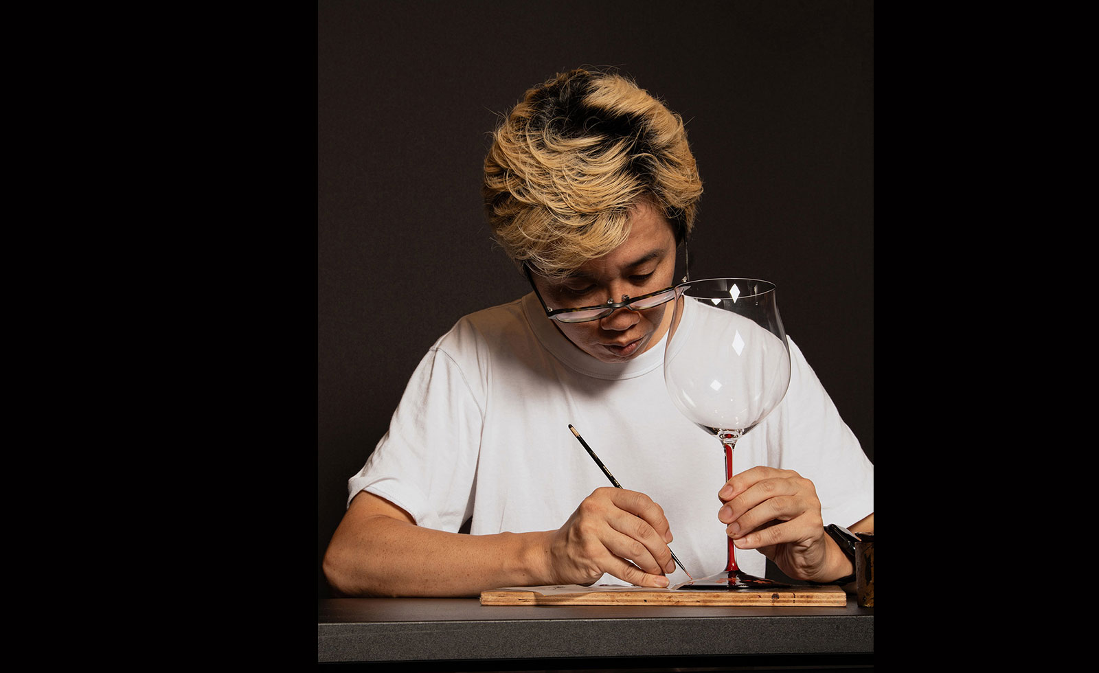 本作『SAKURA』は、兵庫県姫路を拠点に活躍する漆芸家・江藤雄造氏により描かれた芸術的なデザインです。グラスの台座には、日本を象徴する花「桜」と優雅に泳ぐ金魚が、伝統技術「漆塗り」と「蒔絵」を用いてハンドペイントで丁寧に描かれています。