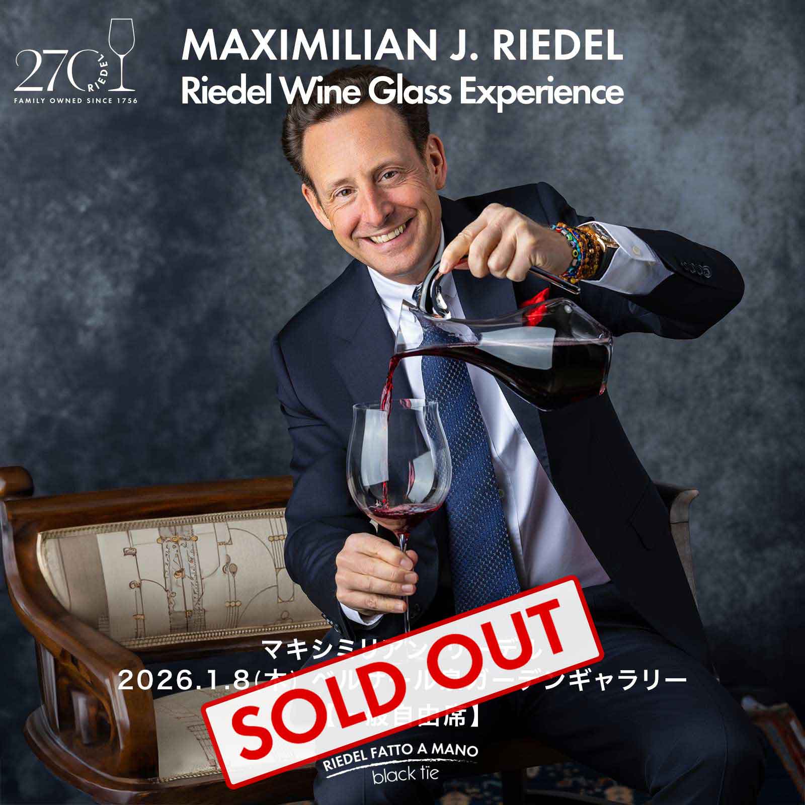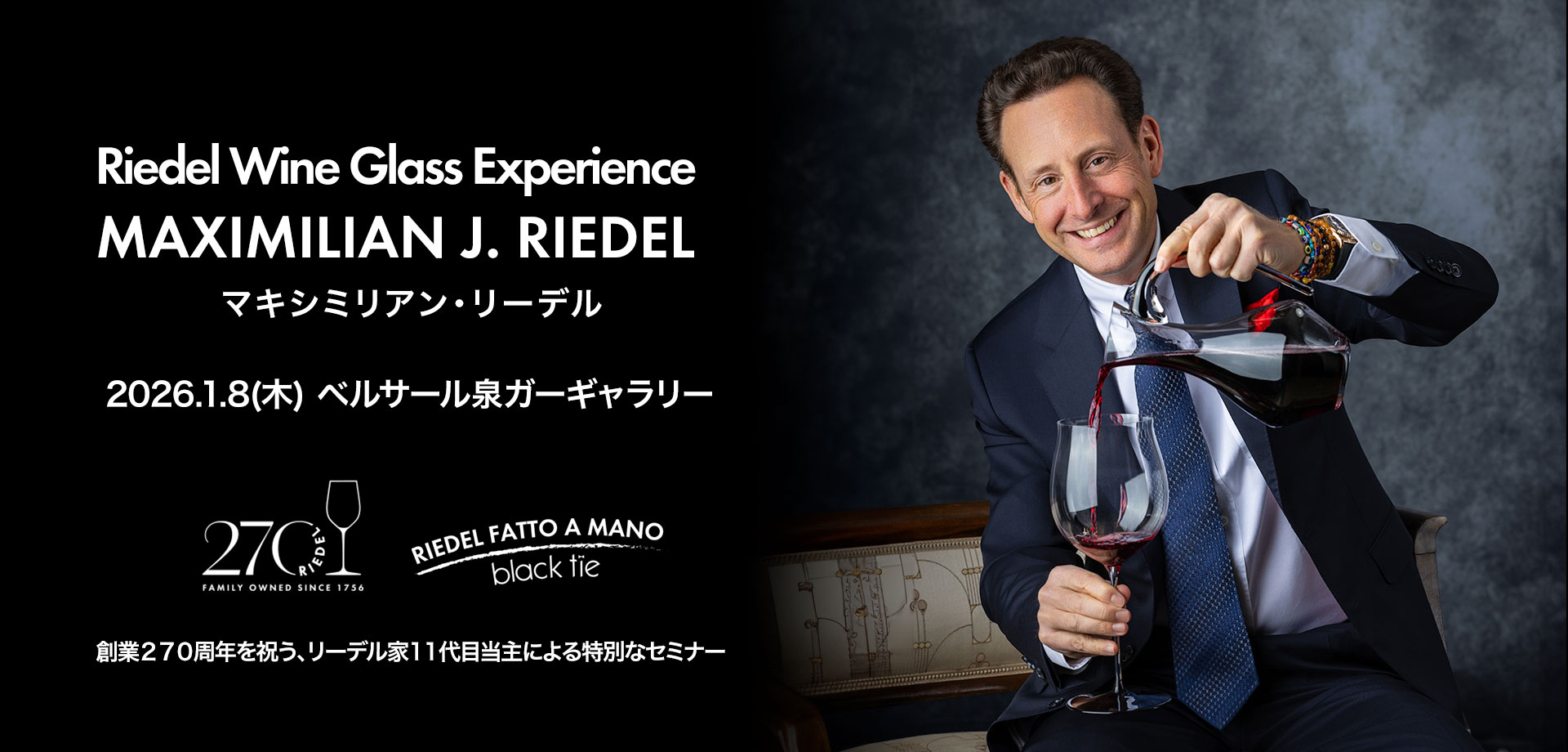 リーデル家11代目当主による一般消費者向けセミナーリーデル創業270周年を記念して、リーデル家11代目当主のマキシミリアン・リーデルが来日し、ワイングラス・テイスティング・セミナーを開催します。