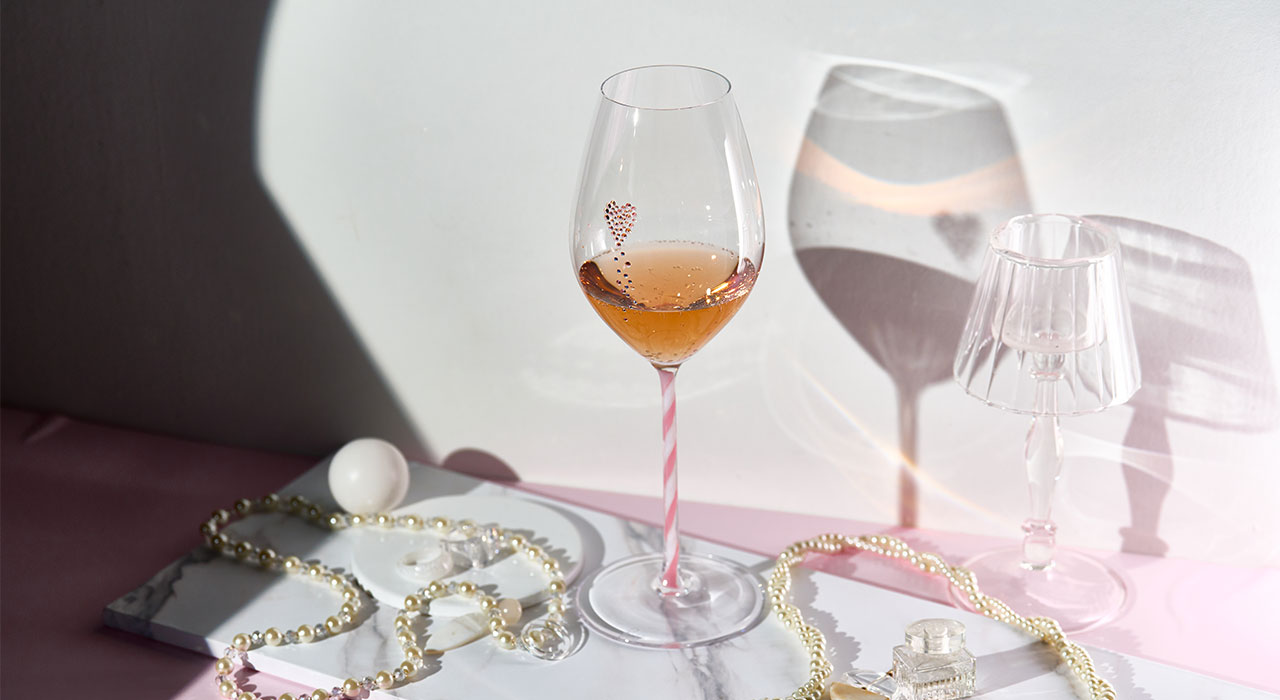 キャンディを思わせるピンク&ホワイトのキュートなツイストステムと、シャンパーニュの泡立ちのように、ふわふわと浮かびきらめくハートのコンビネーションがグラスの存在感をより高めます。さらに、ロゼシャンパーニュとの組み合わせは、可愛らしさが一層引き立つおすすめの楽しみ方です。