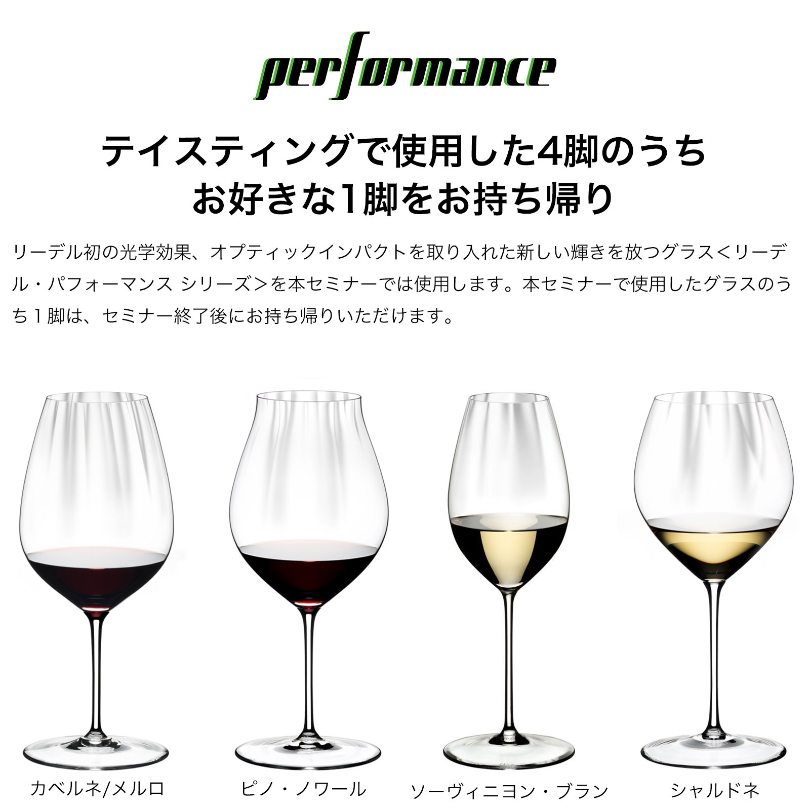 使用するグラスは、光学効果を備えた〈リーデル・パフォーマンス シリーズ〉。 形状の違うグラスで、同じワインの香り・味わいがどう変化するか?を実際に体験しながら、「ワインの本当の楽しみ方」を体感できるセミナーです。