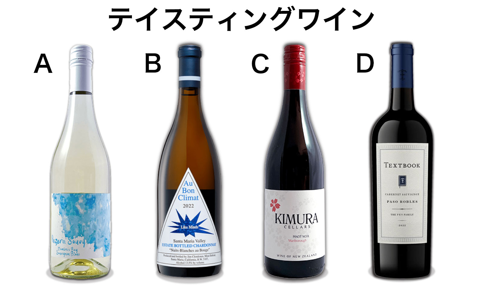 カベルネ・ソーヴィニヨン種とピノ・ノワール種の赤ワイン2種類と、ソーヴィニヨン・ブラン種とシャルドネ種の白ワイン2種類を使用。大変ポピュラーな4品種のワインをテイスティングしていきます。