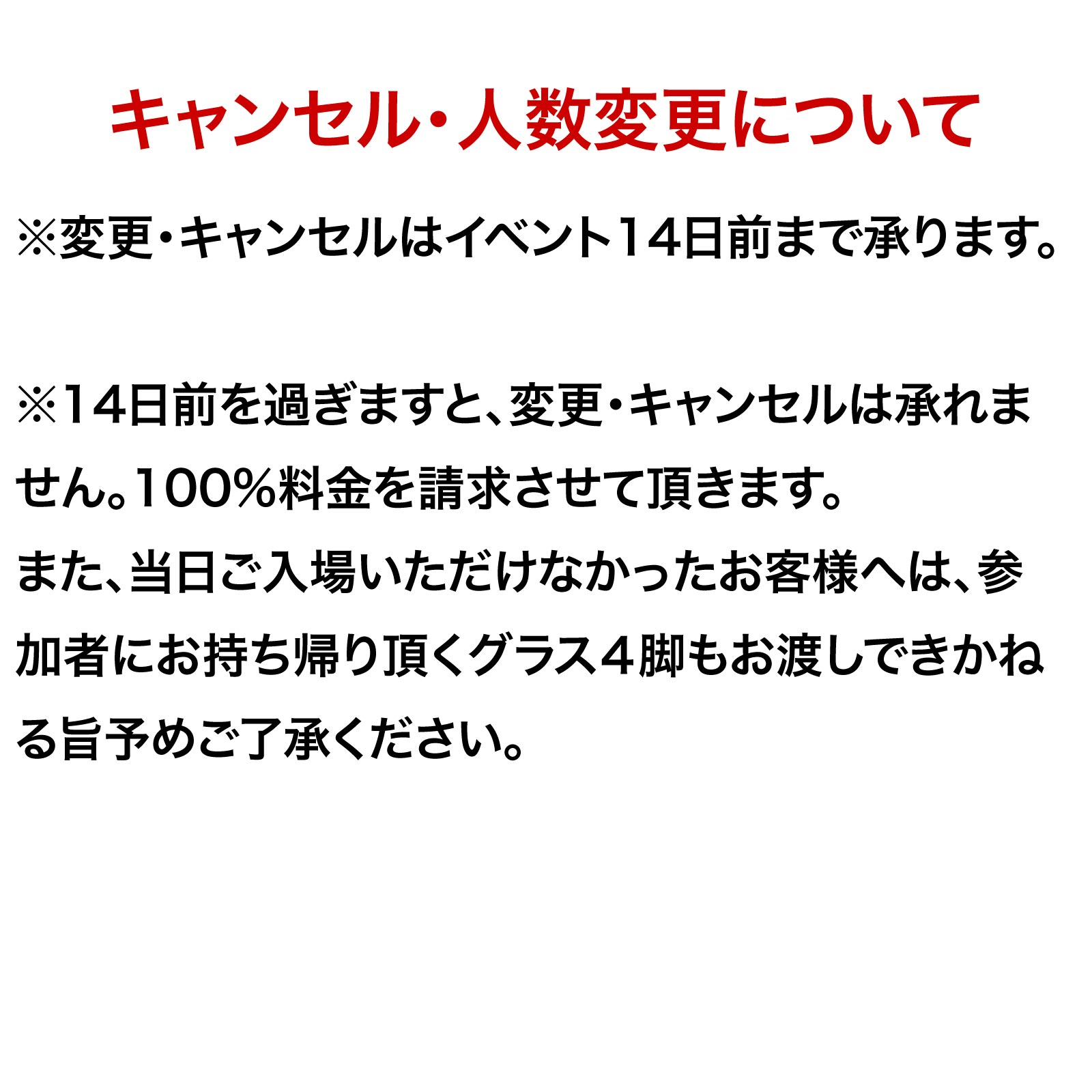 イベント13日前(2025年12月26日(金)0:00)以降につきましては、ご返金やお持ち帰りグラス4脚のお渡しは賜りかねますので予めご了承ください。