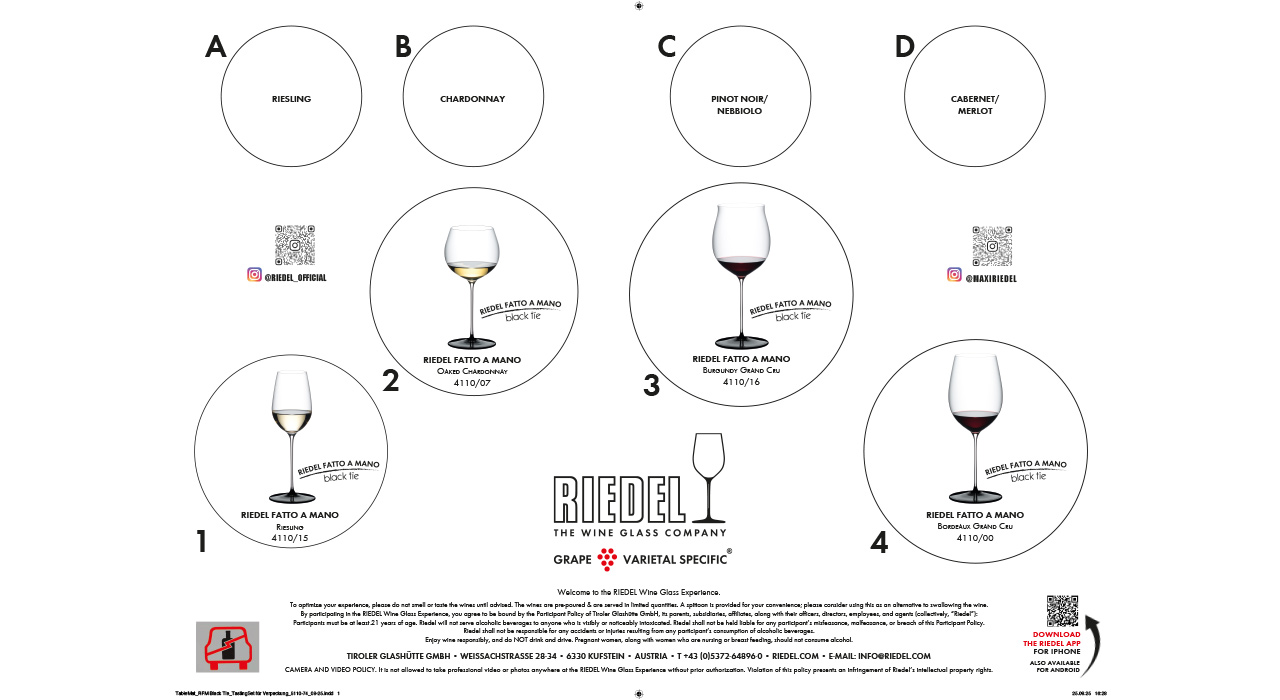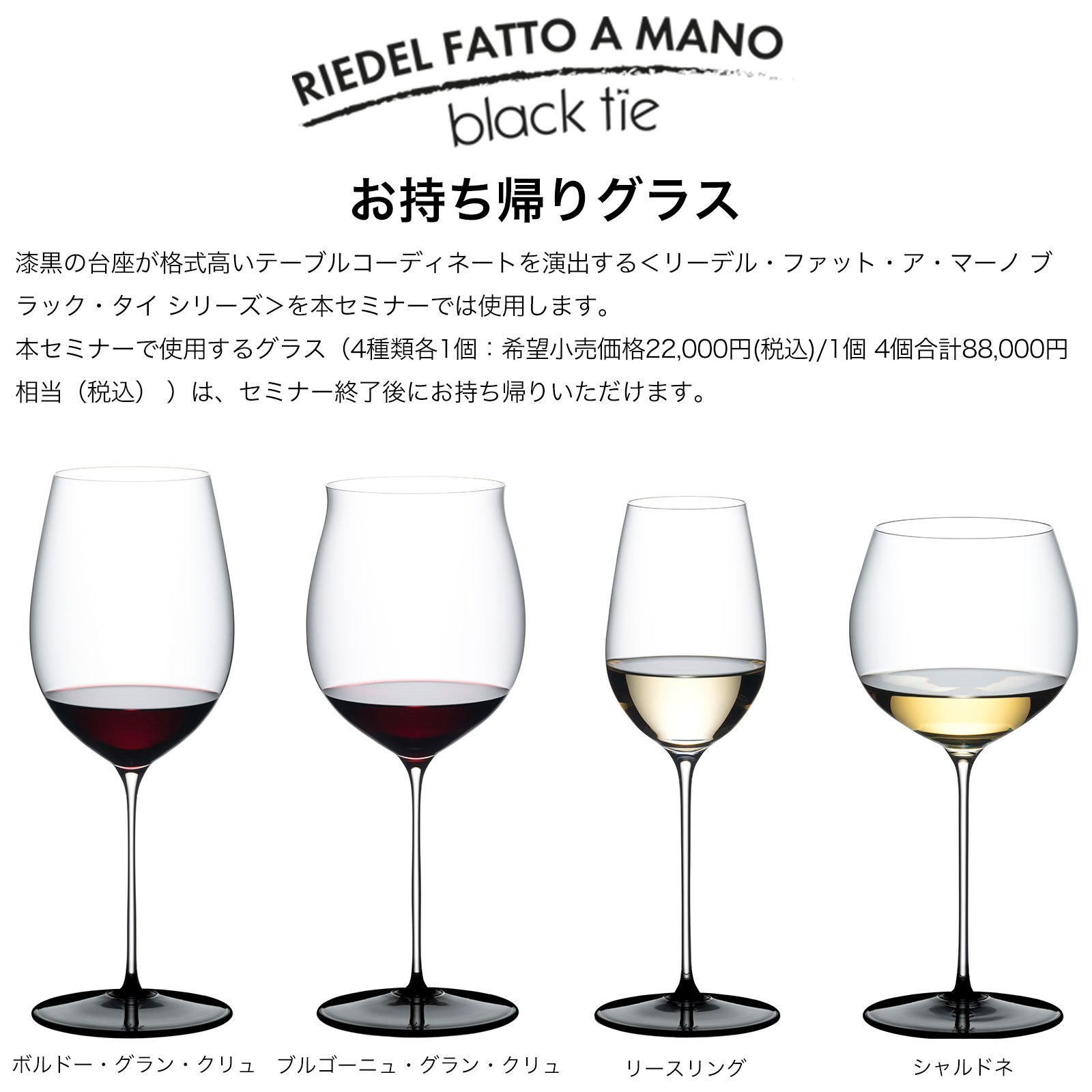 今回は、マシンメイドとハンドメイドの技術を融合し、機能美と優美さを兼ね備えた<リーデル・ファット・ア・マーノ ブラック・タイ シリーズ>を使用した特別セミナーを開催いたします。